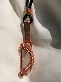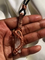 A one-of-one creation, handcrafted with raw clear quartz bound in warm copper spirals. This talisman carries the amplifying clarity of quartz—clearing your energy, elevating your spirit, and keeping you aligned with your higher path. The hammered copper base grounds and shields, while the spiral wirework flows with ancient energy, symbolising protection and infinite movement. Hung on a black leather cord, this piece is both raw and refined, made to be soul-worn every day.