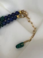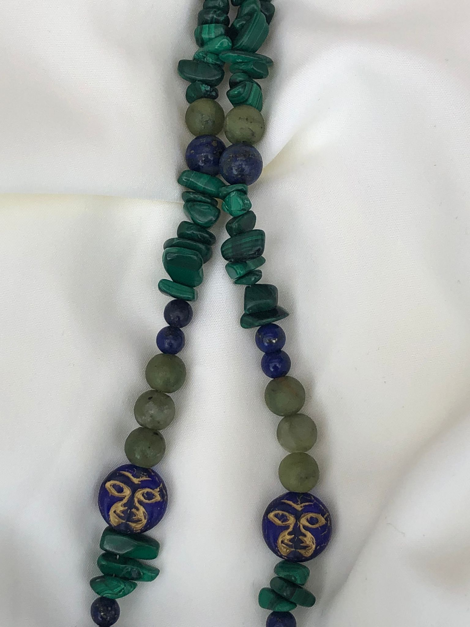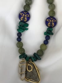 This alluring beaded necklace is a one-of-a-kind creation. It features a combination of 5 different crystals wrapped with brass.